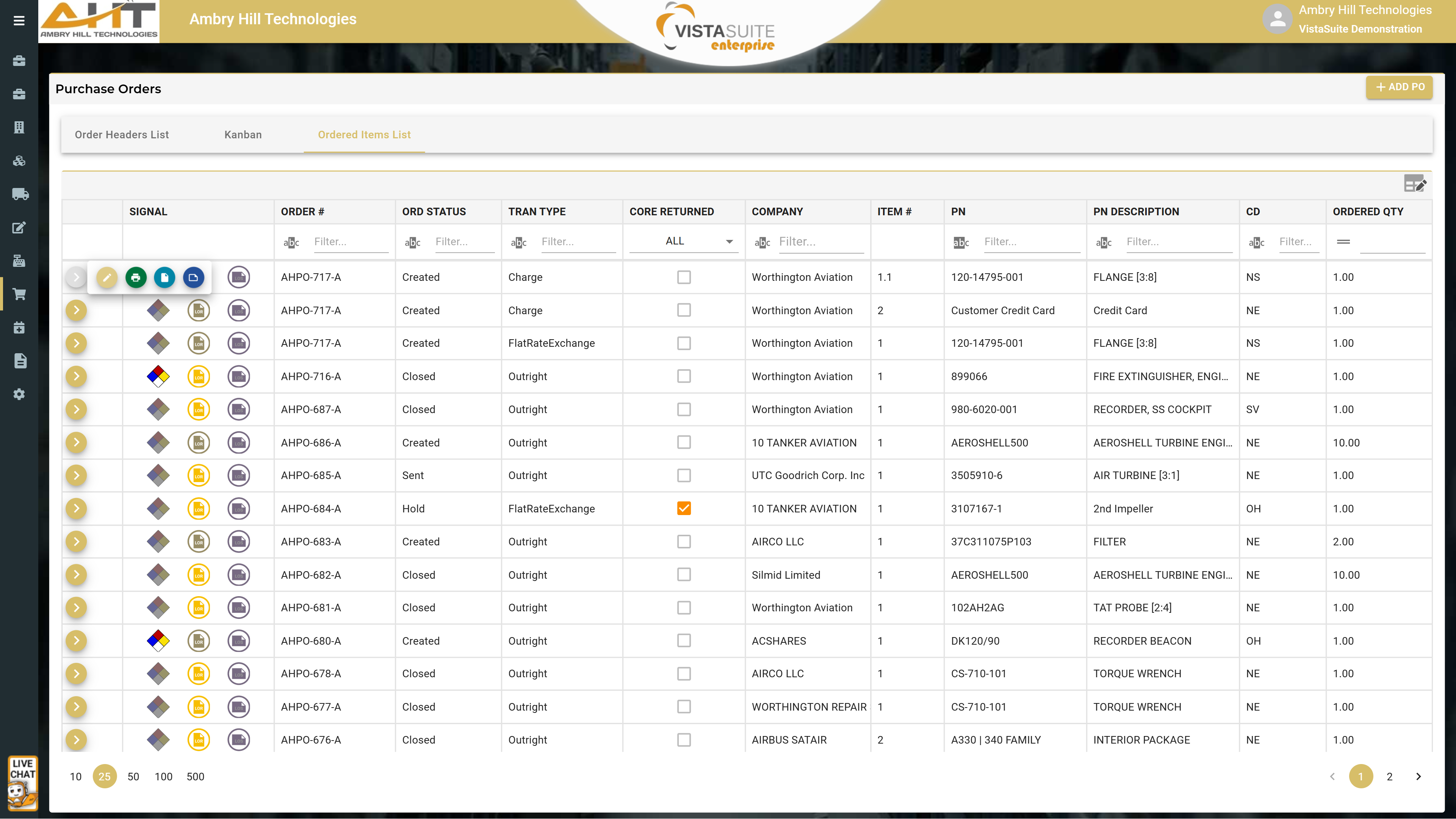 Signals indicate if the purchase order contains hazmat materials, accepted or rejected items, or is linked to a receiving or shipping event. Among the customizable columns displayed is the overall purchase order disposition, allowing for quick awareness of progress without the need to open the record. A quick-action menu includes options to edit, delete, view files, print docs, or clone the purchase order