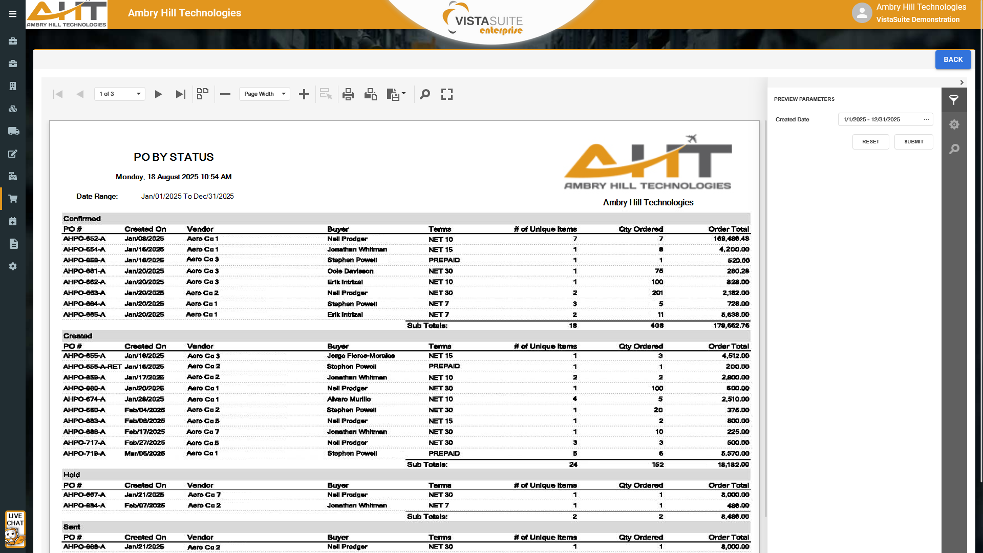 A report summarizing the status of purchase orders, such as confirmed, created, hold, sent, and closed, for example. Customize the status names to your own requirements. The report can be tailored to list details such as vendor, buyer, terms, number of items, etc.