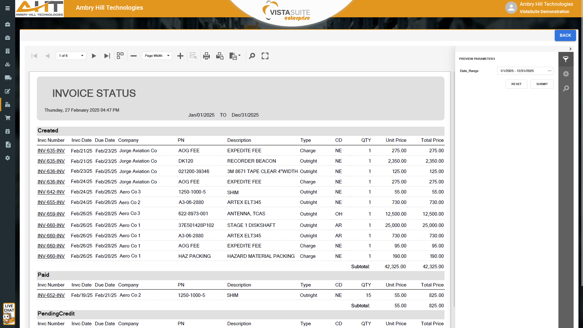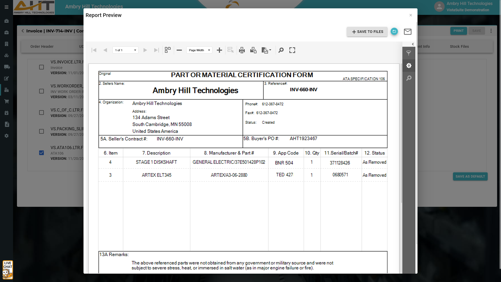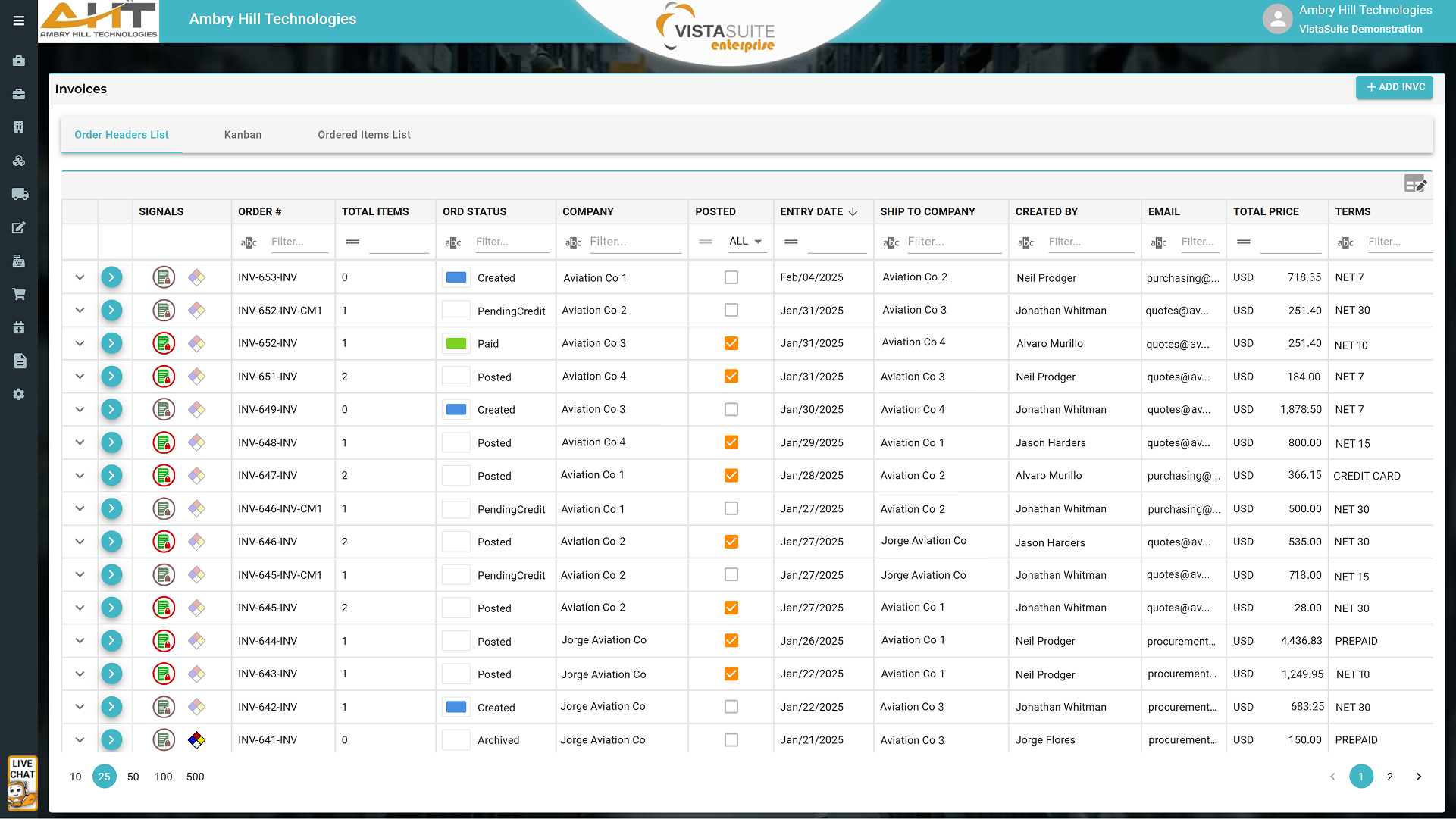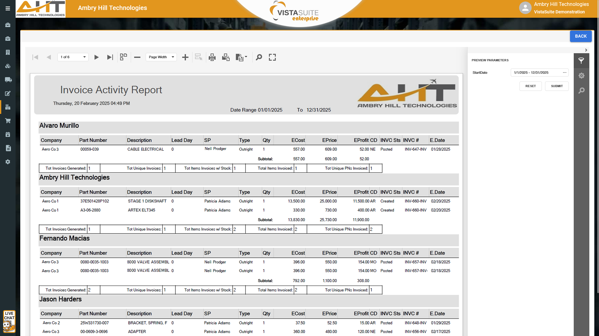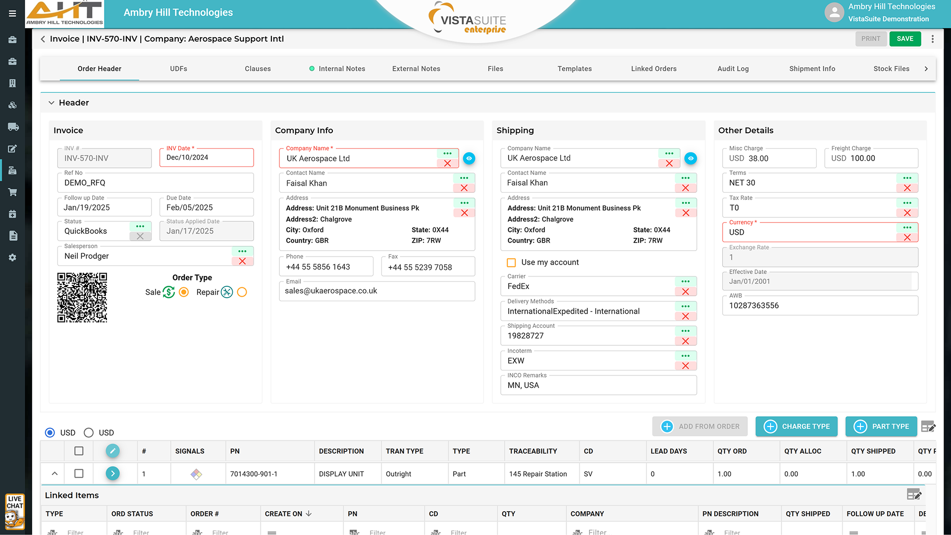 Traditional invoicing processes in aviation parts trading and MRO are often slow, error-prone, and fragmented, leading to wasted time, inconsistent documentation, and potential revenue loss. Vista-Suite Enterprise reforms invoice management with a connected, highly efficient workflow designed specifically for the aviation aftermarket. Its intuitive system navigation and convenient header and item clause selections eliminate manual entry inefficiencies. Bulk line item detail editing speeds up invoice creation, while consolidated inventory file access enhances productivity. Invoices support multi-currency transactions with integrated exchange rate updates, tax code entry, and multiple charge types. Advanced inventory handling allows users to mix and match stock types, simplifying complex sales scenarios. Credit memos are easily accomplished, and precise financial reporting is ensured by keeping the original sale intact. Additional features like alternate part selection, line item traceability, INCO terms, and exchange transaction details provide a comprehensive, flexible invoicing solution.
