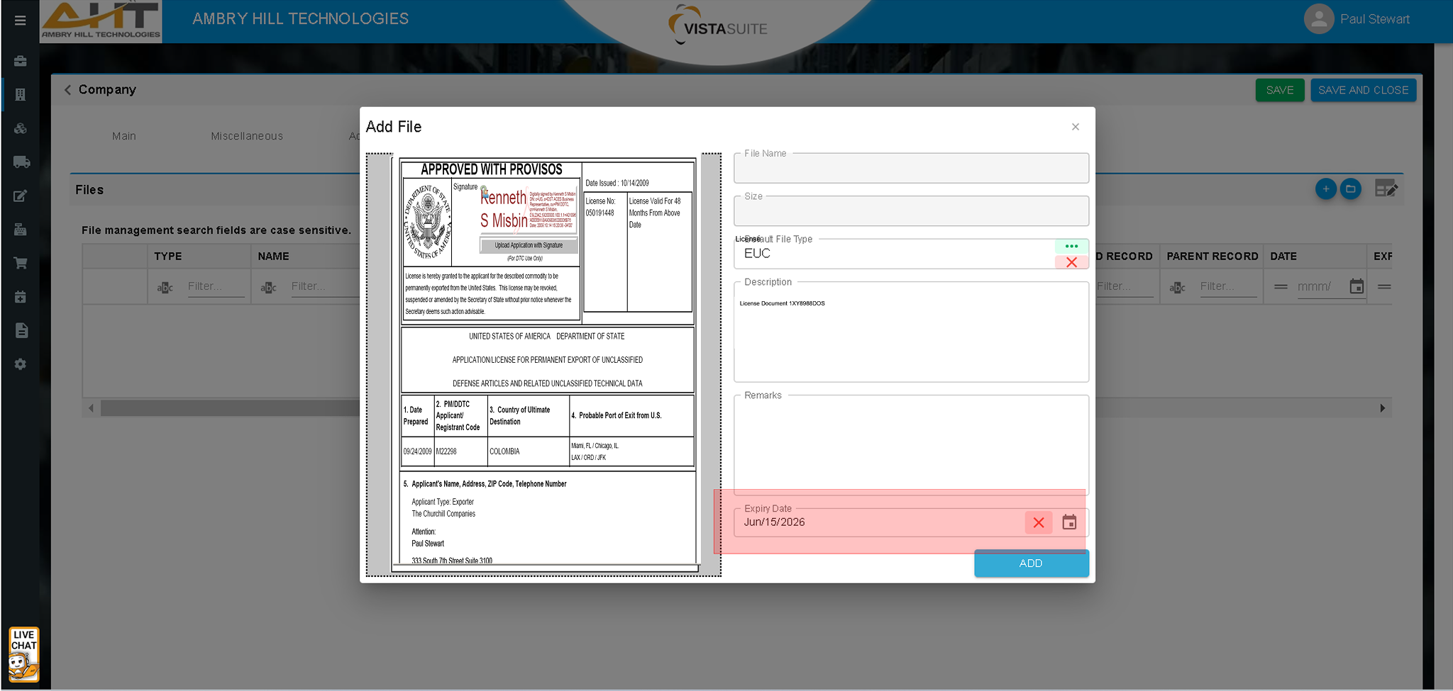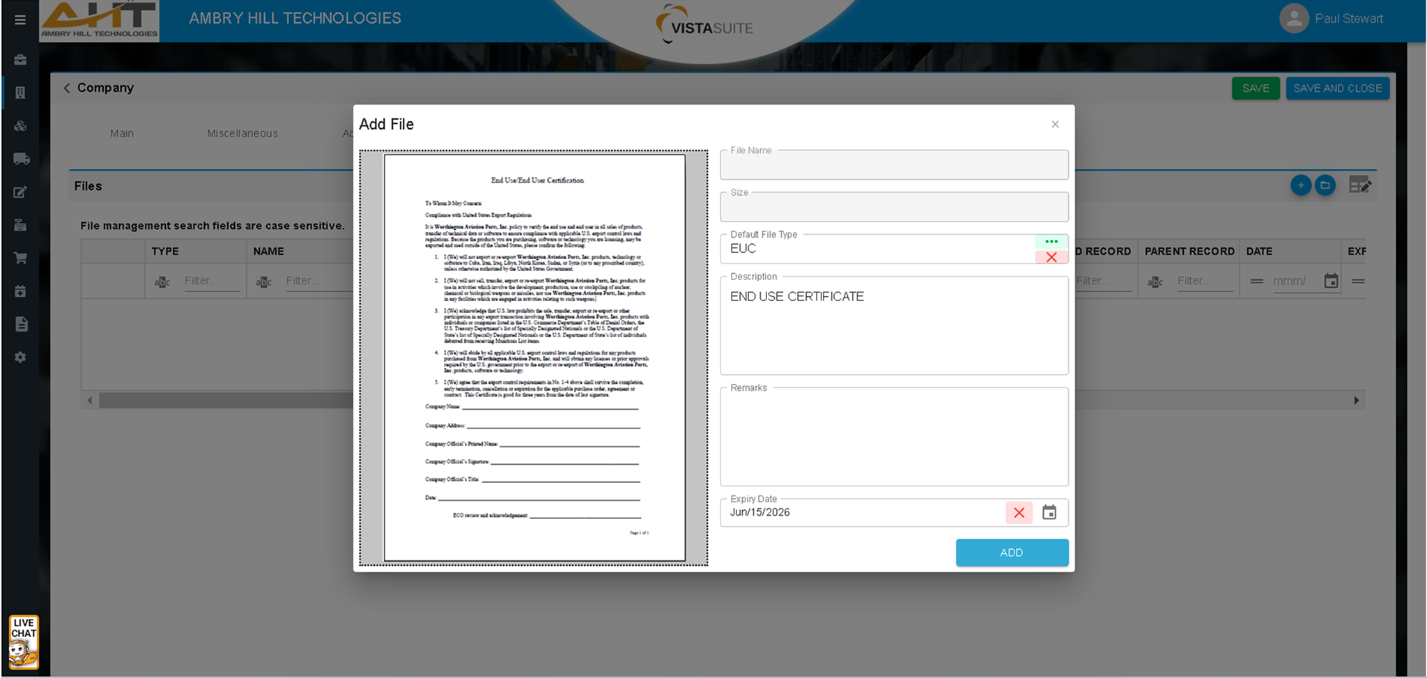 Store scanned End Use Certificates (EUCs) and other vital compliance documentation directly in each company record. Unlike many legacy ERPs that require separate document storage or manual cross-referencing, this centralized approach guarantees quick retrieval for audits and due diligence.