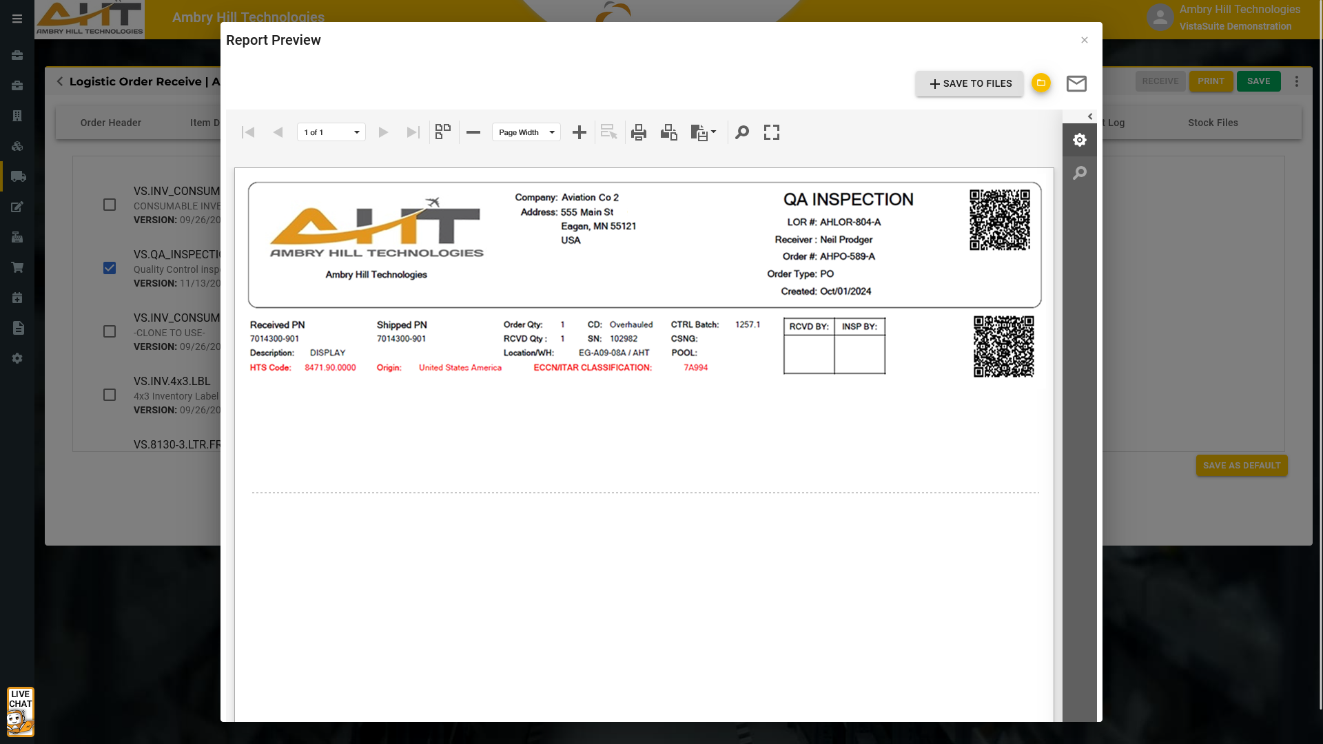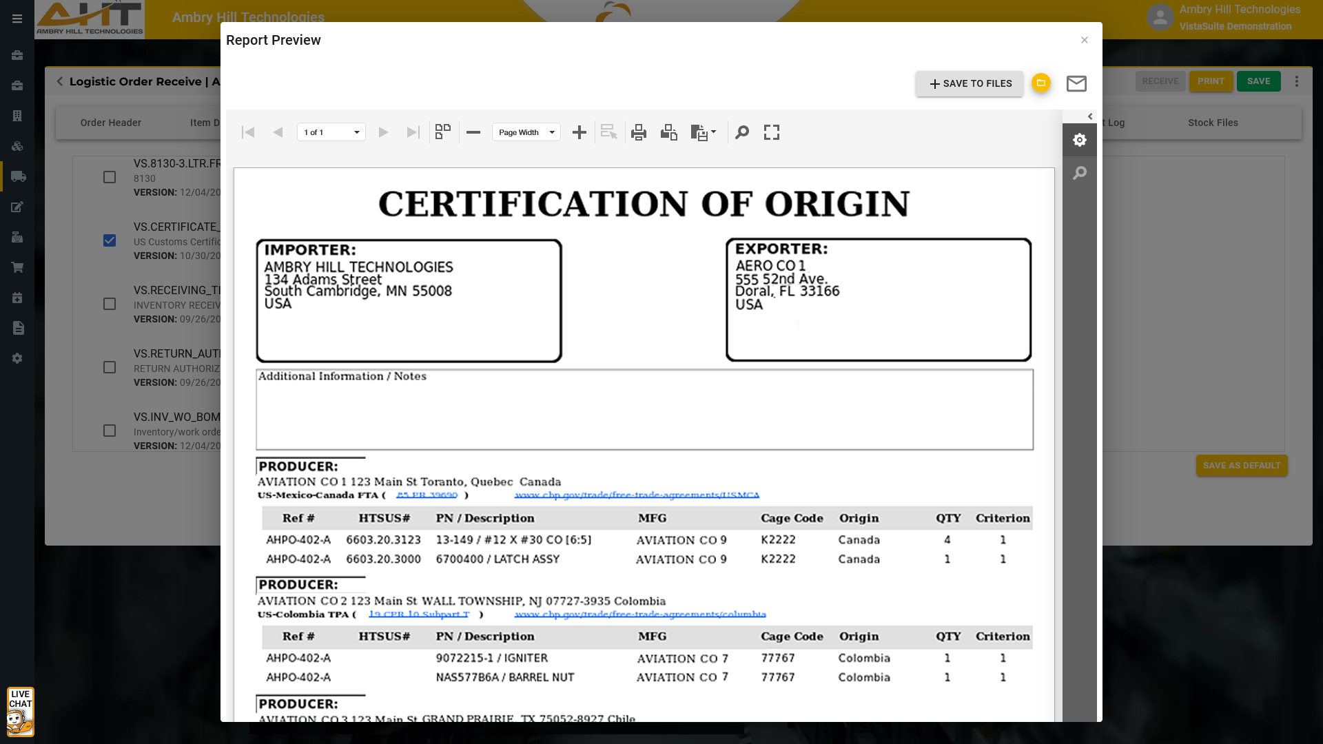 Quality Assurance Inspection Form: When importing goods, it is often necessary to provide Customs with the Source of Origin, or Country, where the product was produced. Vista Suite offers a pre-built Certificate of Origin document found in the Logistics Order Receipt (LOR) application.