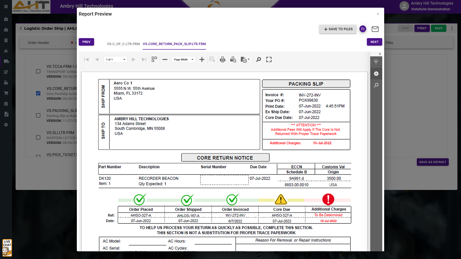 Core Return Pack Slip: The Core Return Pack Slip is a document generated by the Logistics Order Shipping (LOS) module to accompany the shipment of a part that requires a core return. It provides clear instructions and reference details for the recipient to return the used or repairable core component. Typically included in the outbound shipment, the slip stays with the new or overhauled part and serves as both a return authorization and tracking reference when the core is sent back. This document helps streamline the reverse logistics process, reduce delays in core returns, and ensure proper matching of returned cores to original transactions.