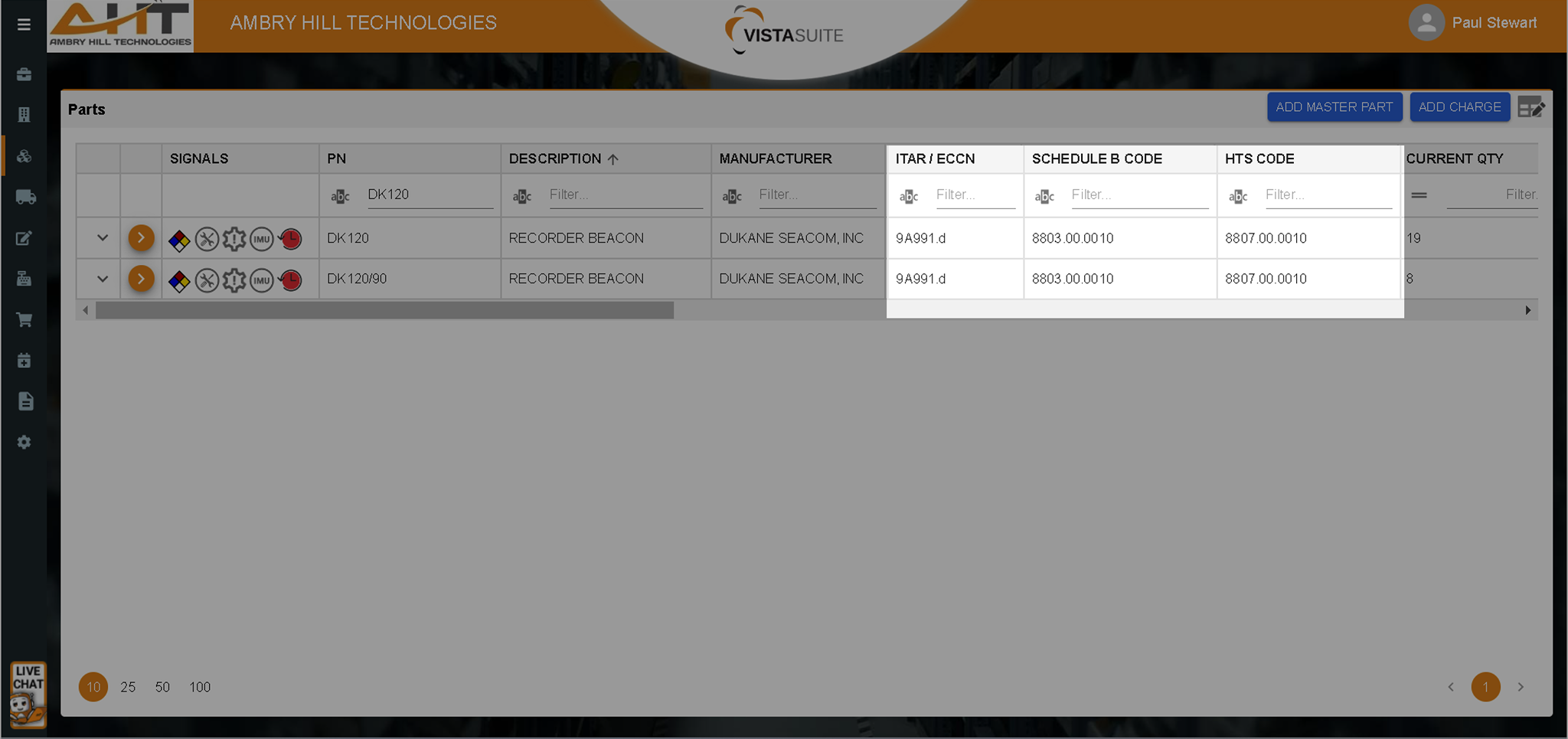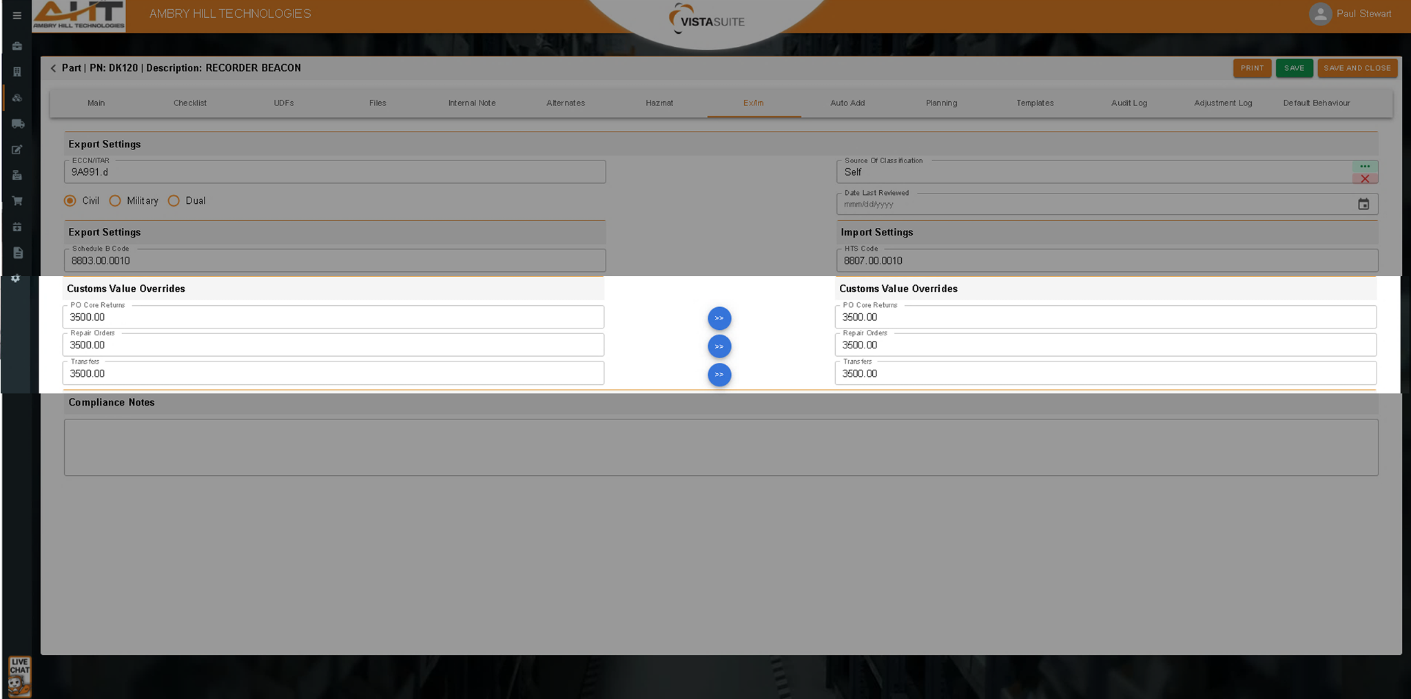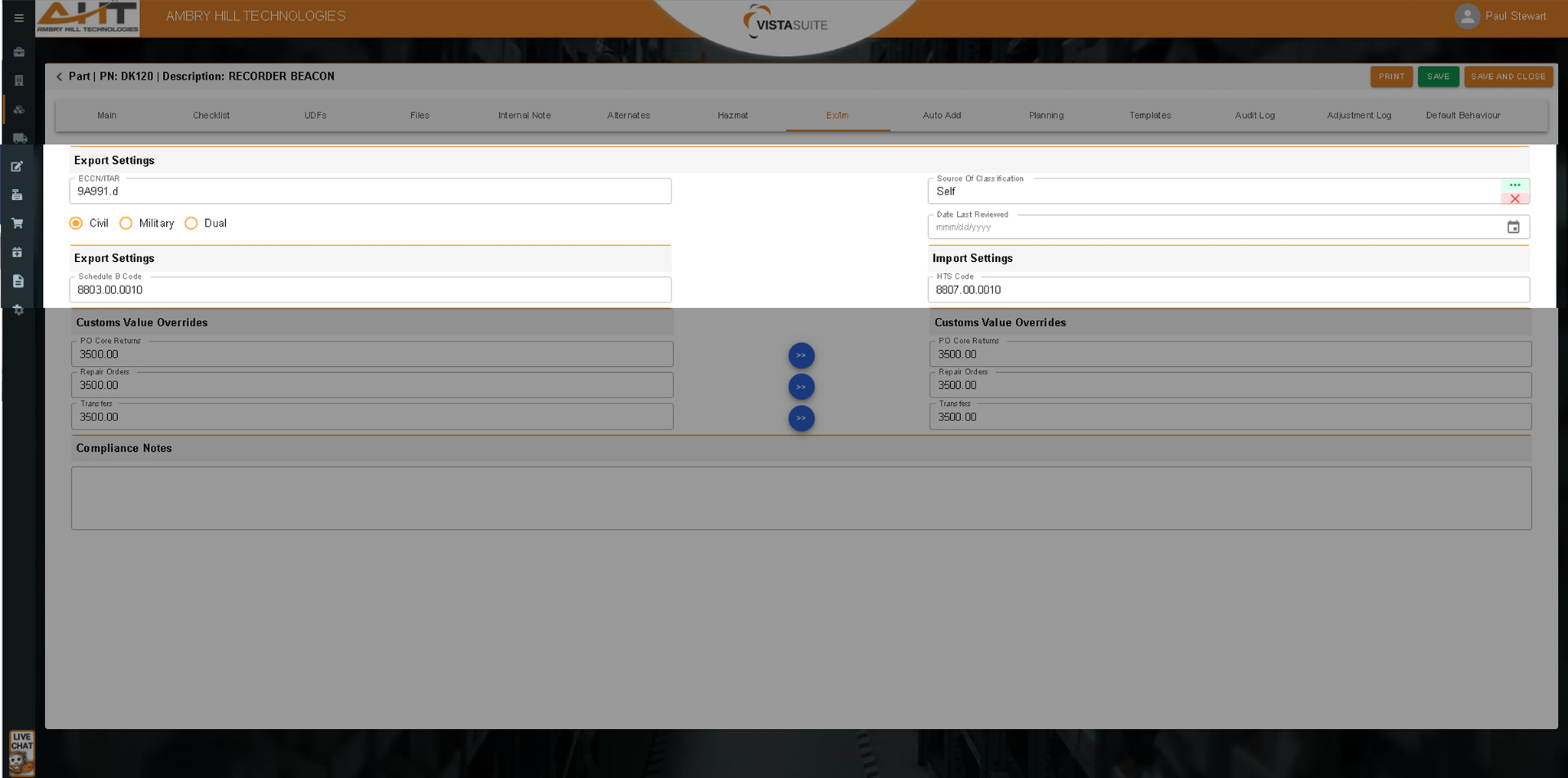 Purpose-built for international trade, fields in the part master record (ECCN, ITAR, Schedule B, HTS, etc.) support granular export/import control at the part level. This is far more flexible than the limited catalog fields typically found in other aviation ERP software, ensuring that classification data is quickly accessible where needed.