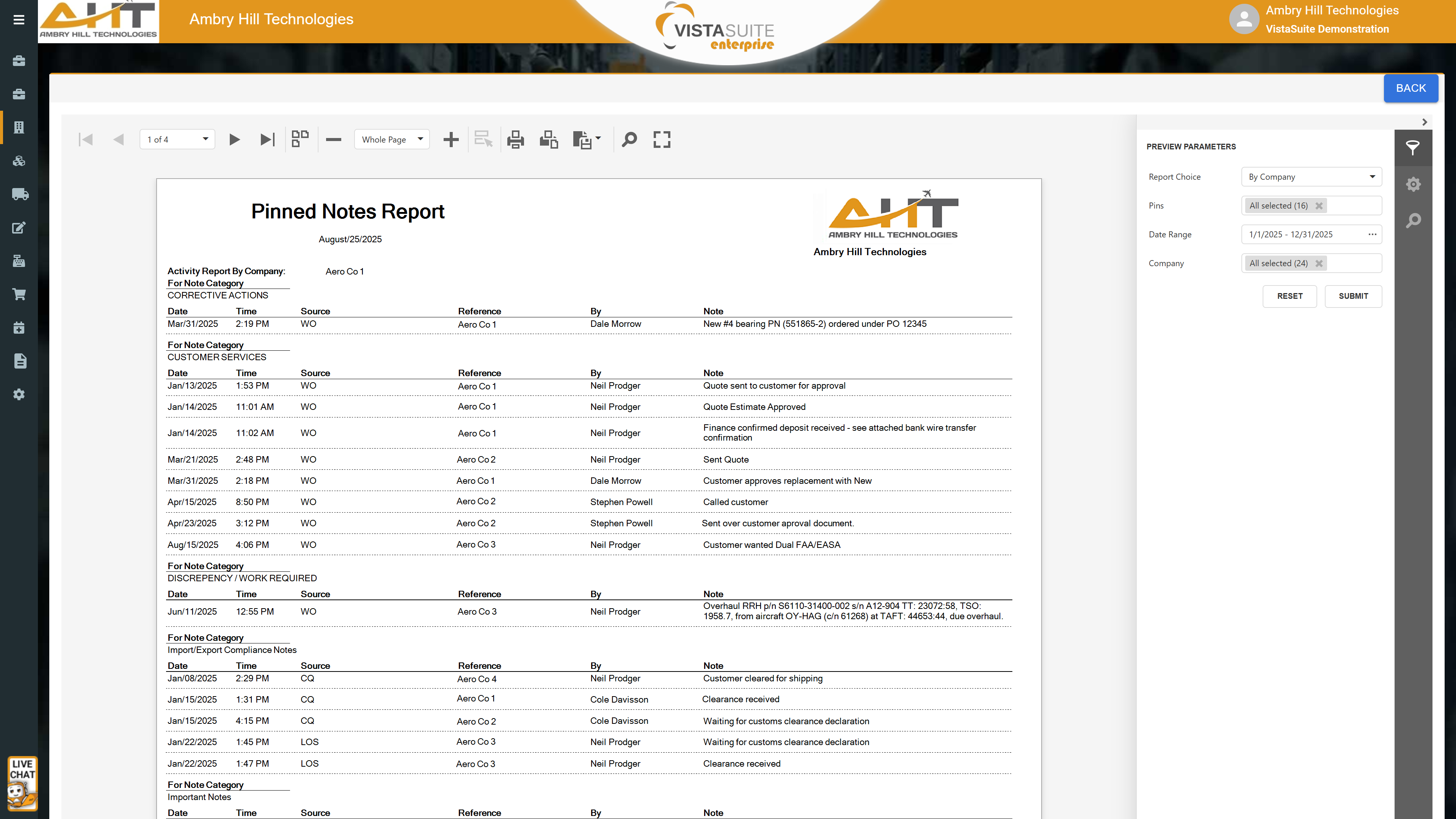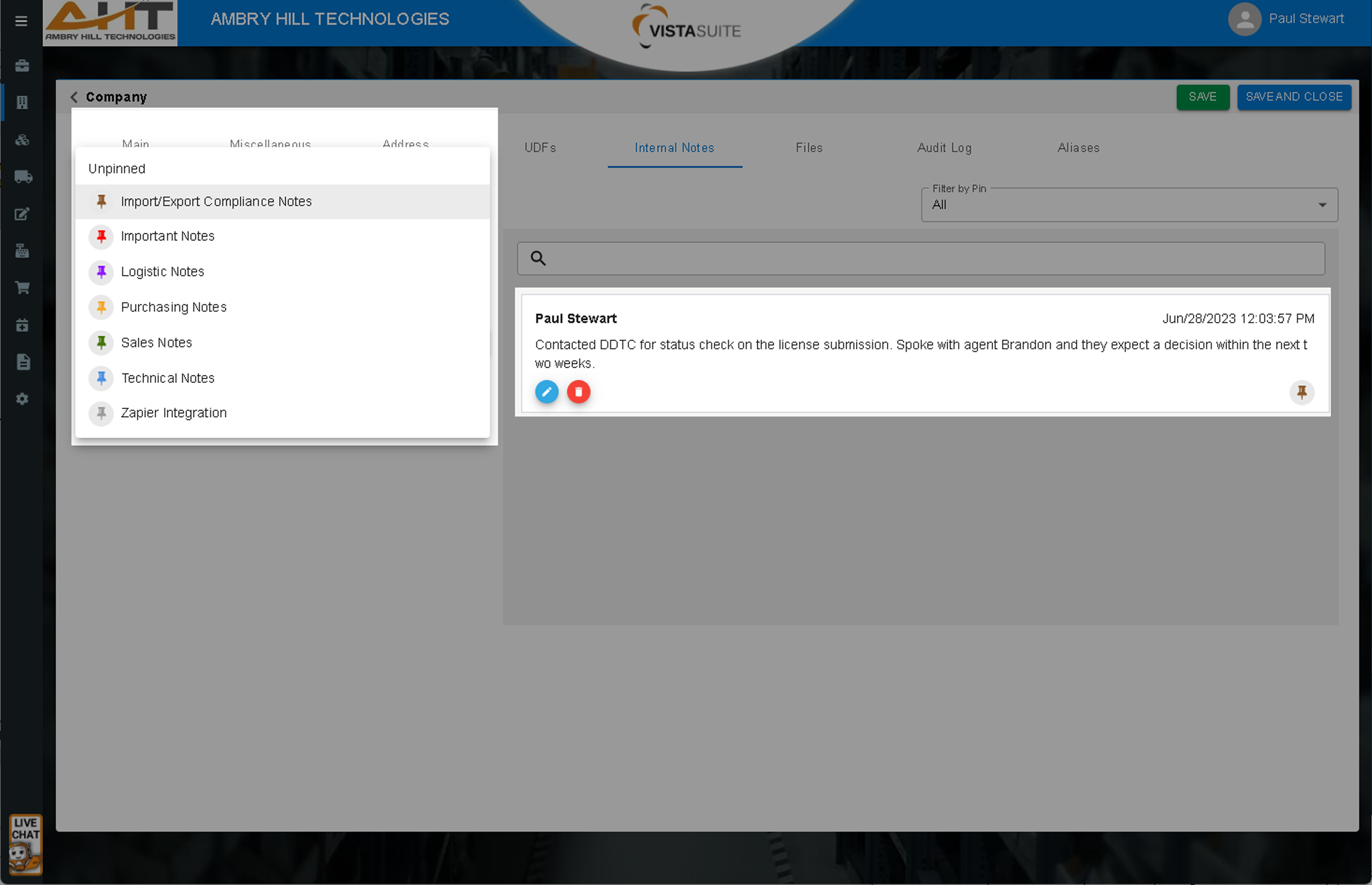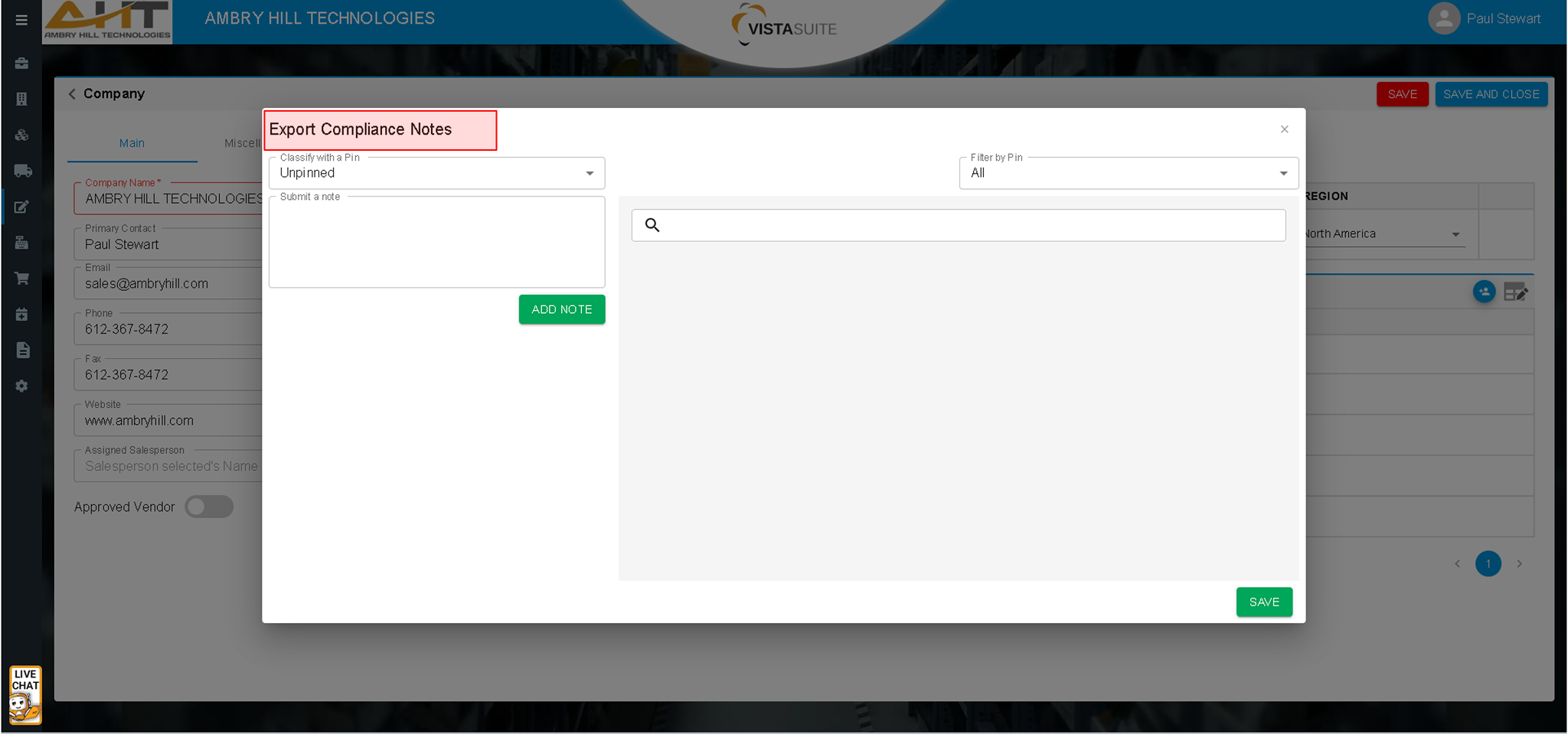 Create, categorize, and date/time-stamp compliance notes across all transactions. This level of structured documentation is totally unique to Vista-Suite Enterprise. Attach files to a note, lock a note, search, filter on notes, and even run reports on different pin categories. Vista-Suite Enterprise's pinned note system is so powerful that some companies use it instead of a CRM. A dedicated compliance note area prevents mixing with general notes. This is a massive advantage for efficient team communication and compliance awareness.