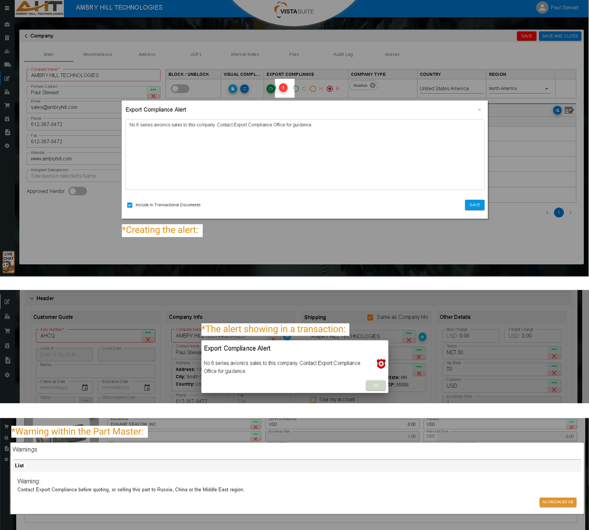 Presents actionable, user-acknowledged compliance warnings at key transaction points (i.e. initiating quotes, sales orders, etc.) to proactively prevent compliance mistakes that could easily be missed in older, less interactive systems.