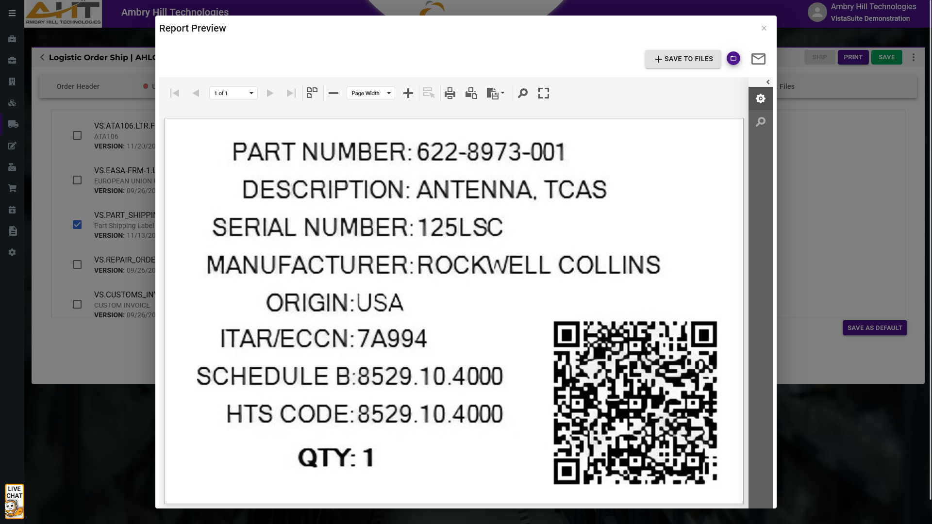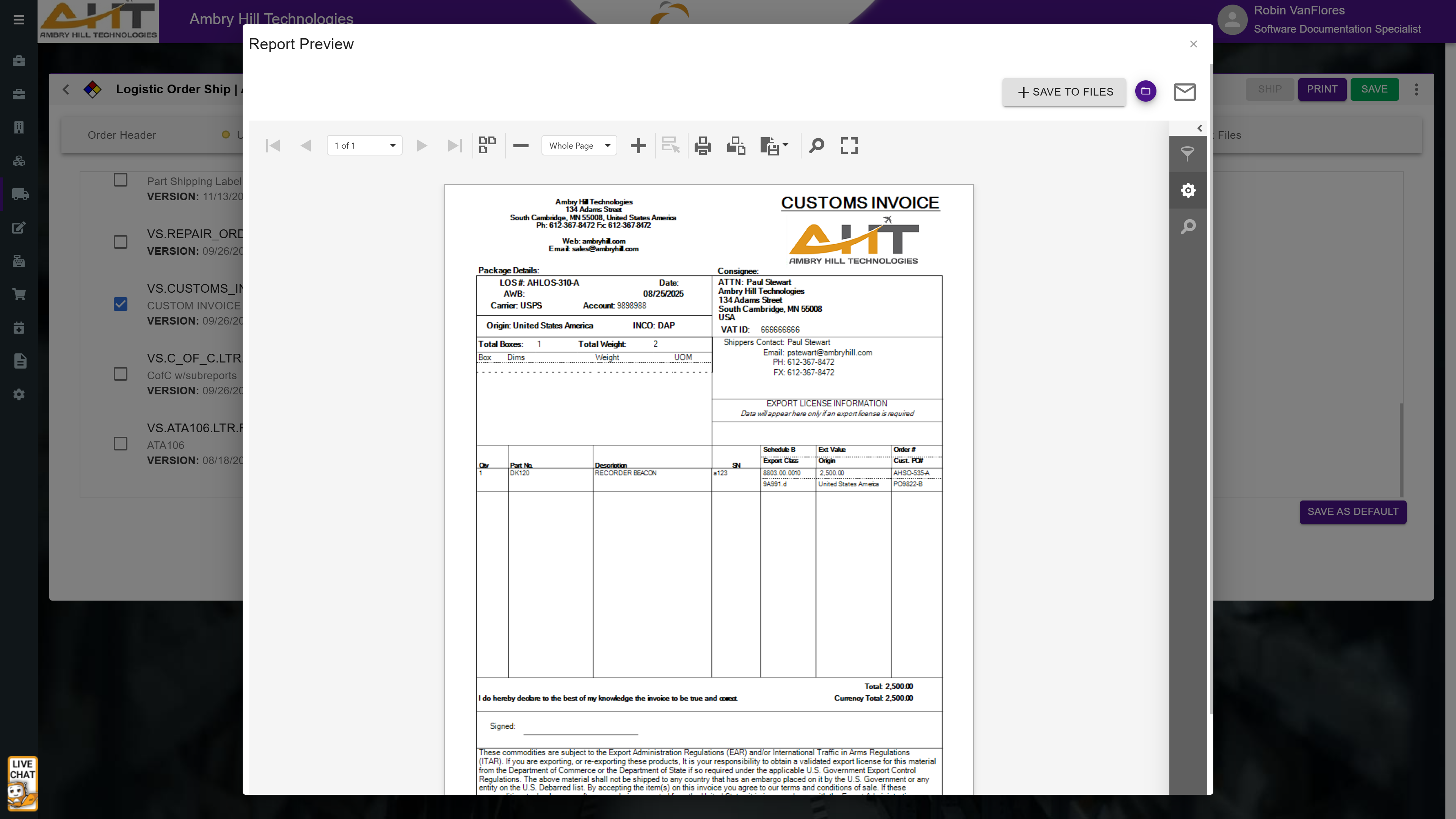 The Customs Invoice, generated by the Logistics Order Shipping (LOS) module, is a required document for international shipments. It provides customs authorities with all the necessary details to assess duties, taxes, and ensure the legal movement of goods across borders. This includes information such as item descriptions, quantities, declared value, country of origin, HTS codes, Incoterms, and full shipper and consignee details. The Vista-Suite Enterprise LOS system automatically pulls this data from the corresponding order, reducing manual entry and minimizing errors. By standardizing this critical document, the system helps shippers maintain compliance with global trade regulations and avoid delays in customs clearance.