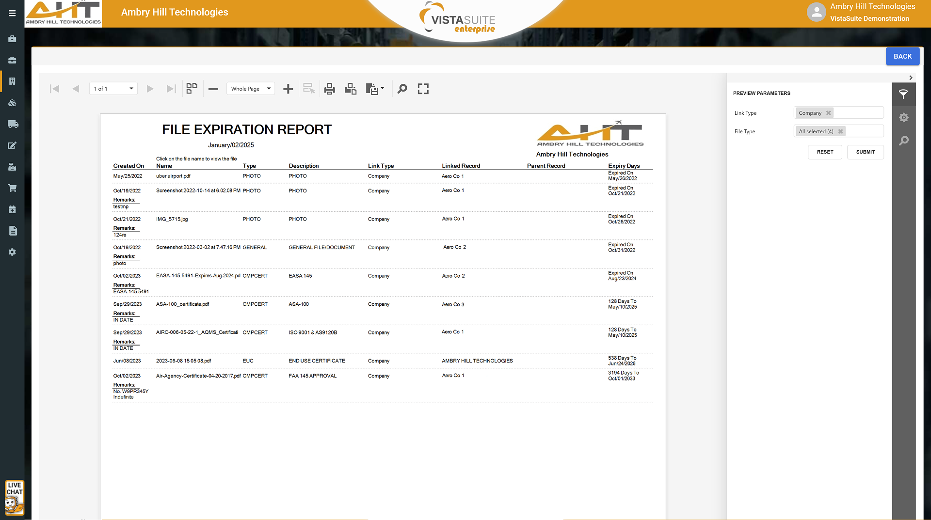 Expiring Documents Report: Lists files and documents based on expiration dates to determine ones requiring attention.