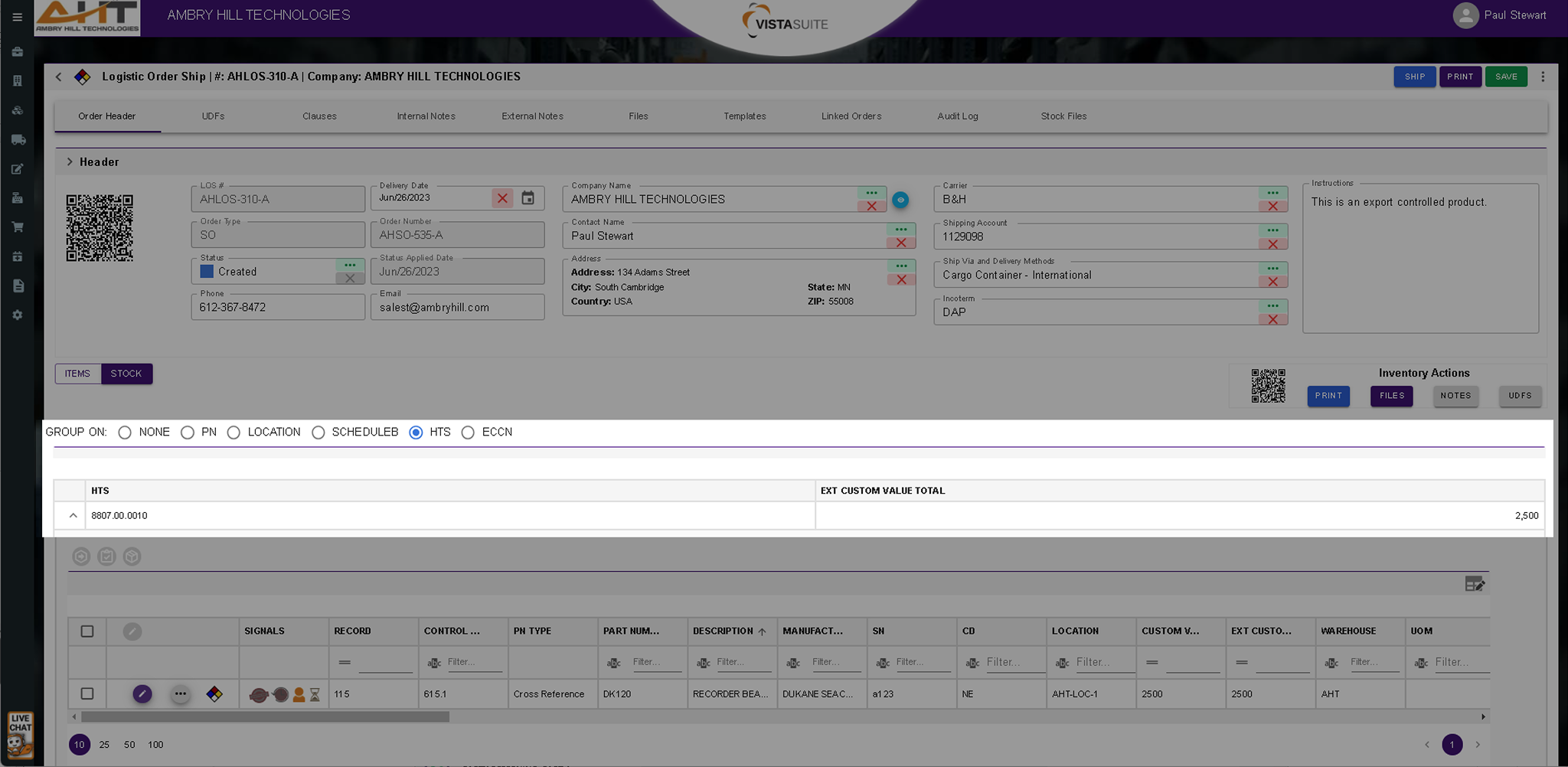 The Logistics Order Ship (LOS) transaction interface distinguishes between a general "items" view (representing the ordered or expected items) and a detailed "stock" view (representing the individual inventory records/serialized parts). If you toggle to the Stock View, you can quickly total your customs values by Part Number, Location, Schedule B, HTS, or ECCN codes. This makes filing for your Shipper’s Export Declaration (SED) quick and easy.