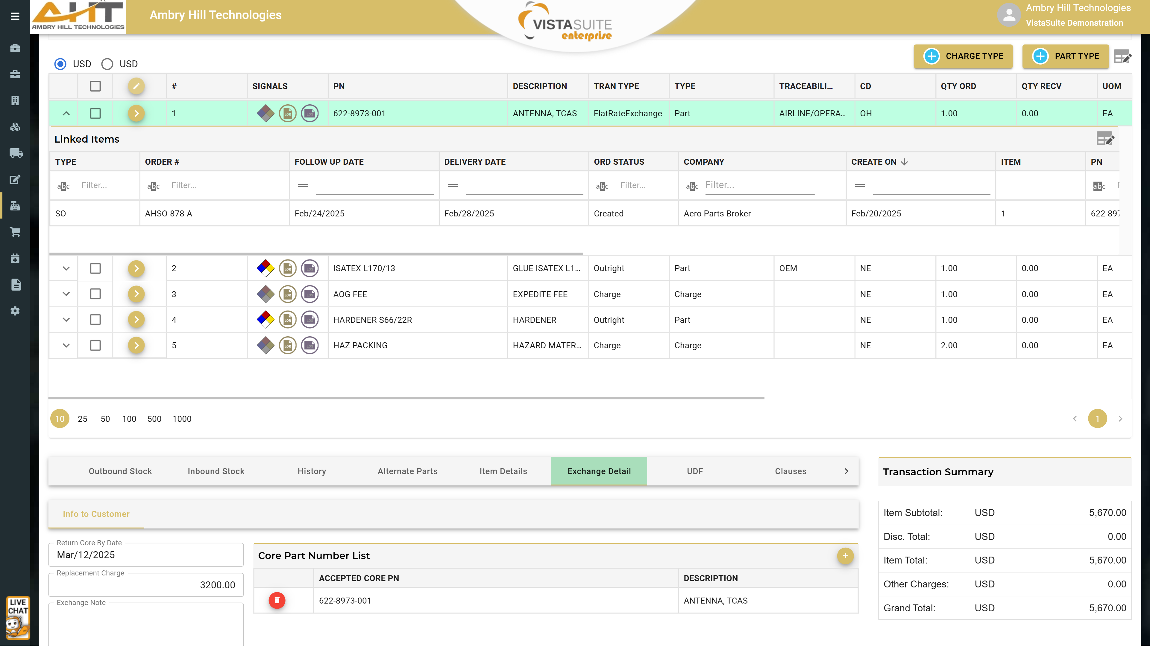 At the top is an expanded line item where linked orders are displayed. Below is the transaction summary of totals, followed by a reference to the overall cost and profit margin. Also notice the exchange details for the selected line item.