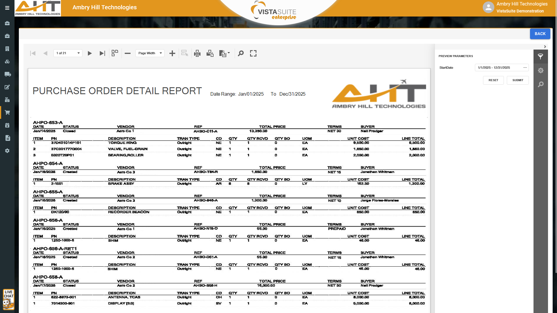 A detailed breakdown of purchase orders, including item descriptions, quantities, prices, transaction types, fulfillment status, and many other descriptive elements.