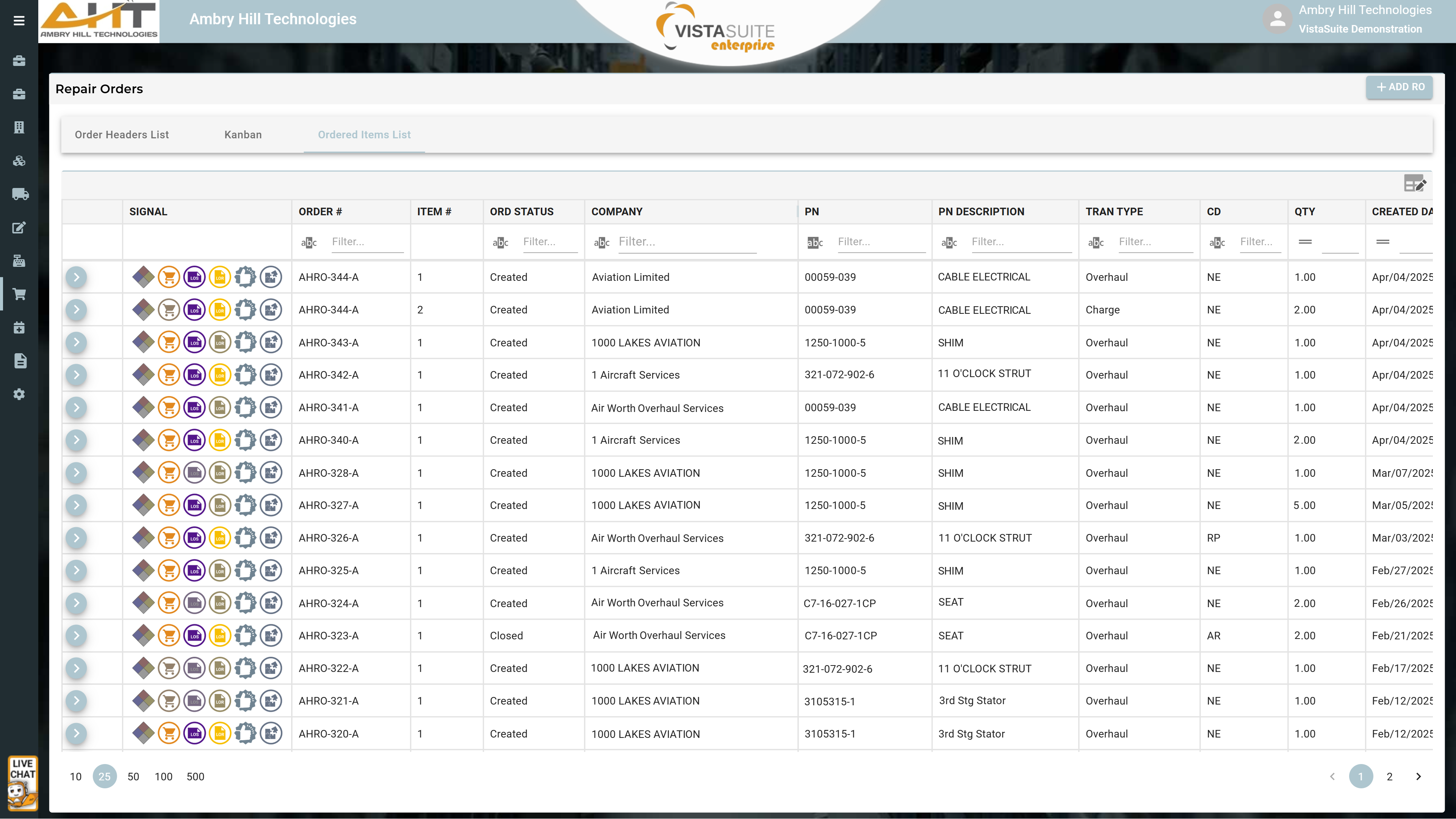 The expanded portion reveals repair order line items and at-a-glance signals that indicate if an item is a hazardous material, allocated, shipped, invoiced, linked to a receiving or shipping event, is approved, or has piece parts. Among the customizable columns displayed is the item disposition, allowing for quick awareness of progress without the need to open the record.