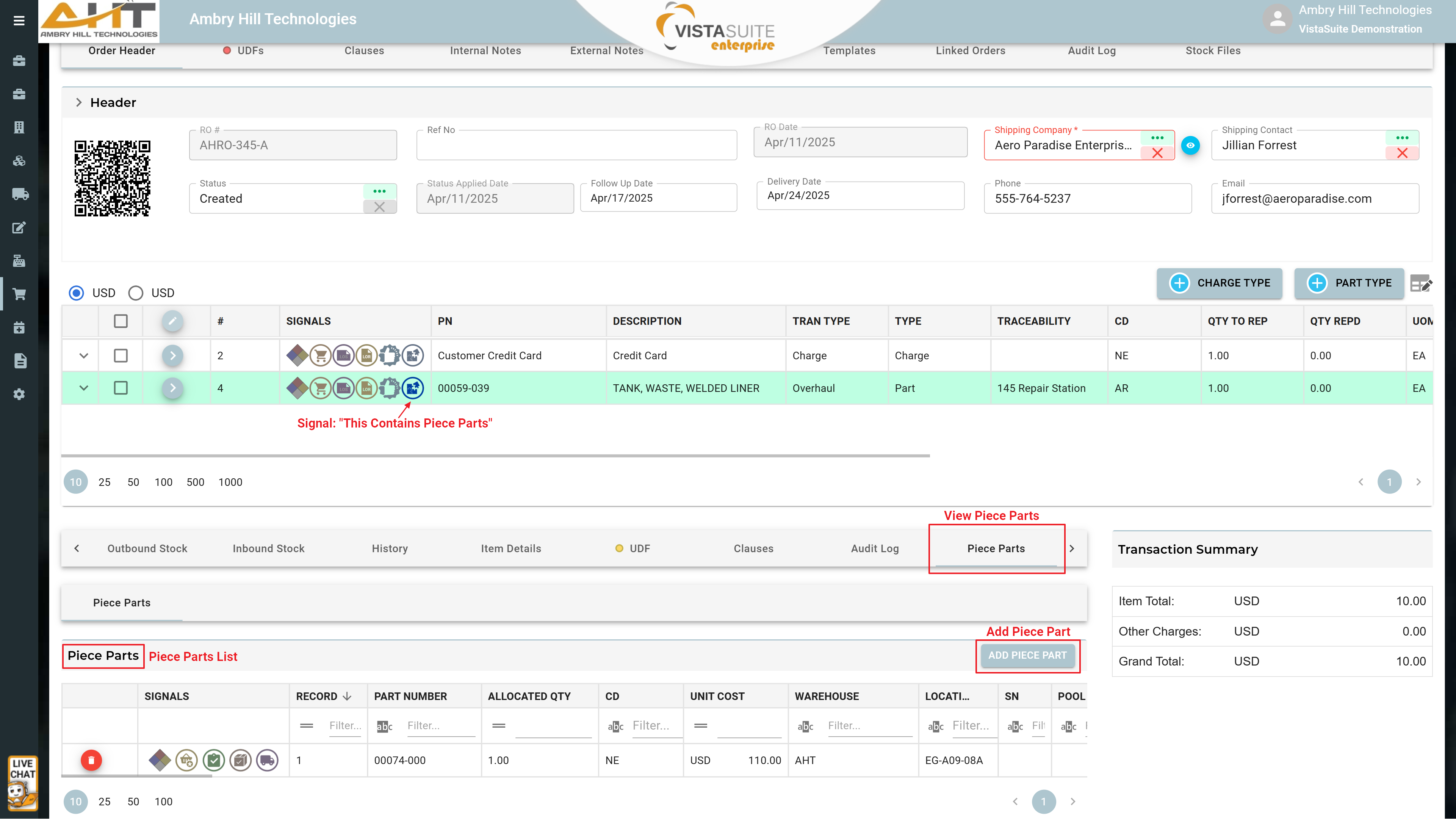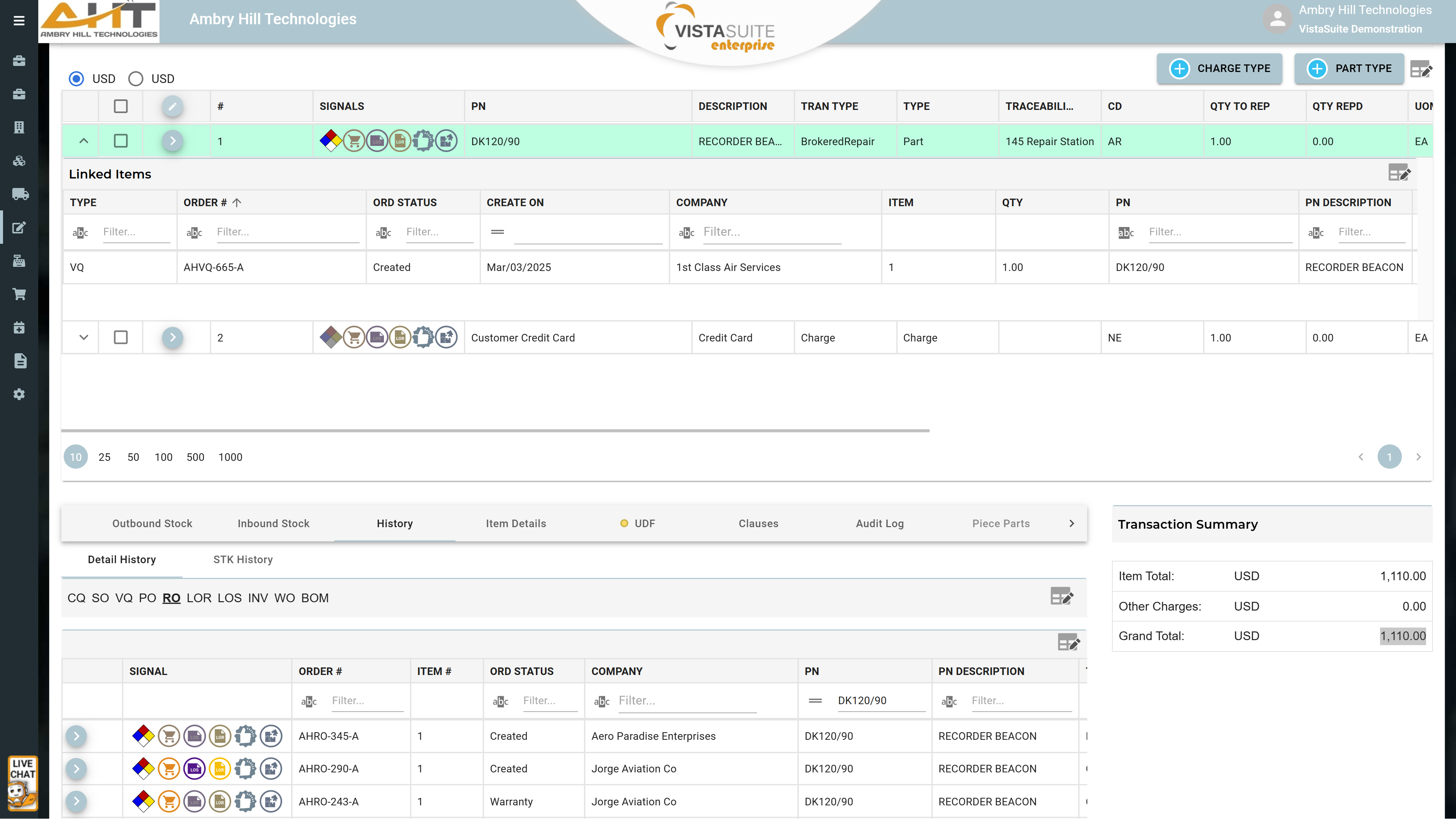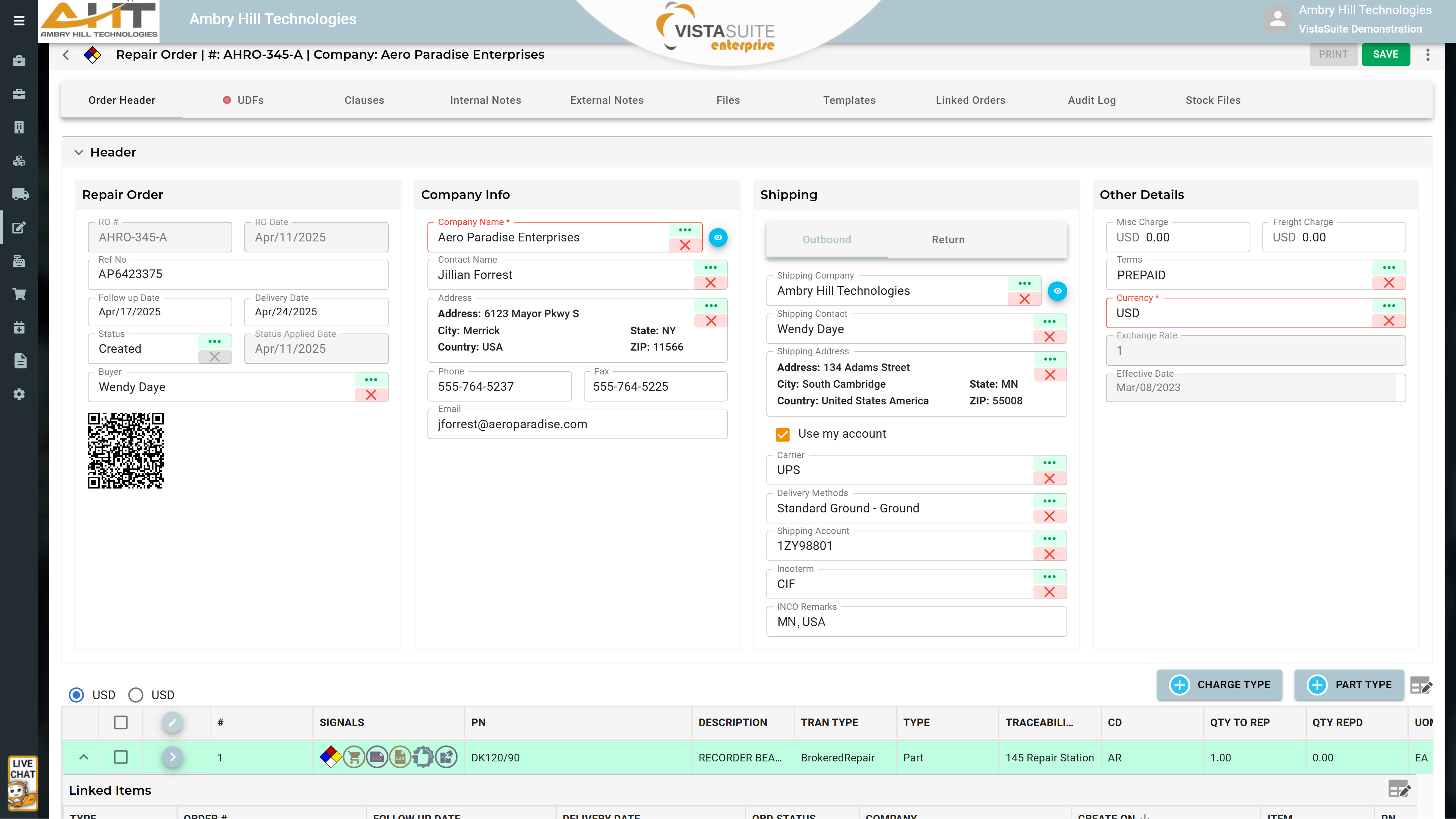 Vista-Suite Enterprise offers robust repair order capabilities tailored for aviation MRO and part 145 repair station operations. Users can assign separate outbound and inbound shipping addresses to ensure items are returned to the correct facility, including for core exchanges. Piece part costs are calculated from prior transactions, with system warnings for ownership mismatches. Charges can be applied directly to part numbers, and passthrough fields for freight and miscellaneous costs are excluded from tax. Line items can pull from regular, consigned, or pool inventory, and support multiple transaction types such as flat-rate exchange or overhaul within a single order. Repair orders link directly to sales orders, receiving events, and related transactions, with tools for copying charges, batch document printing, and customizable templates.