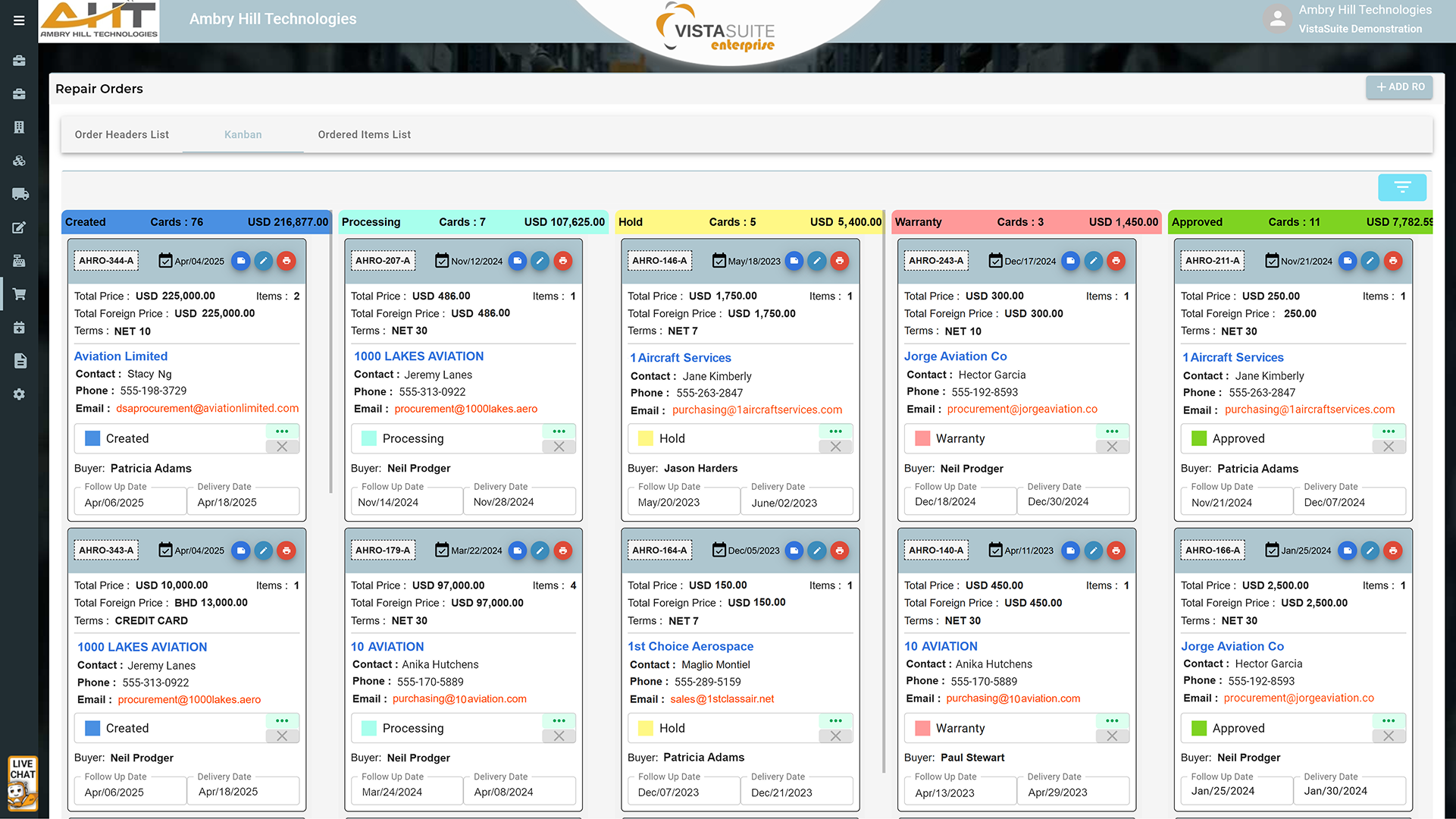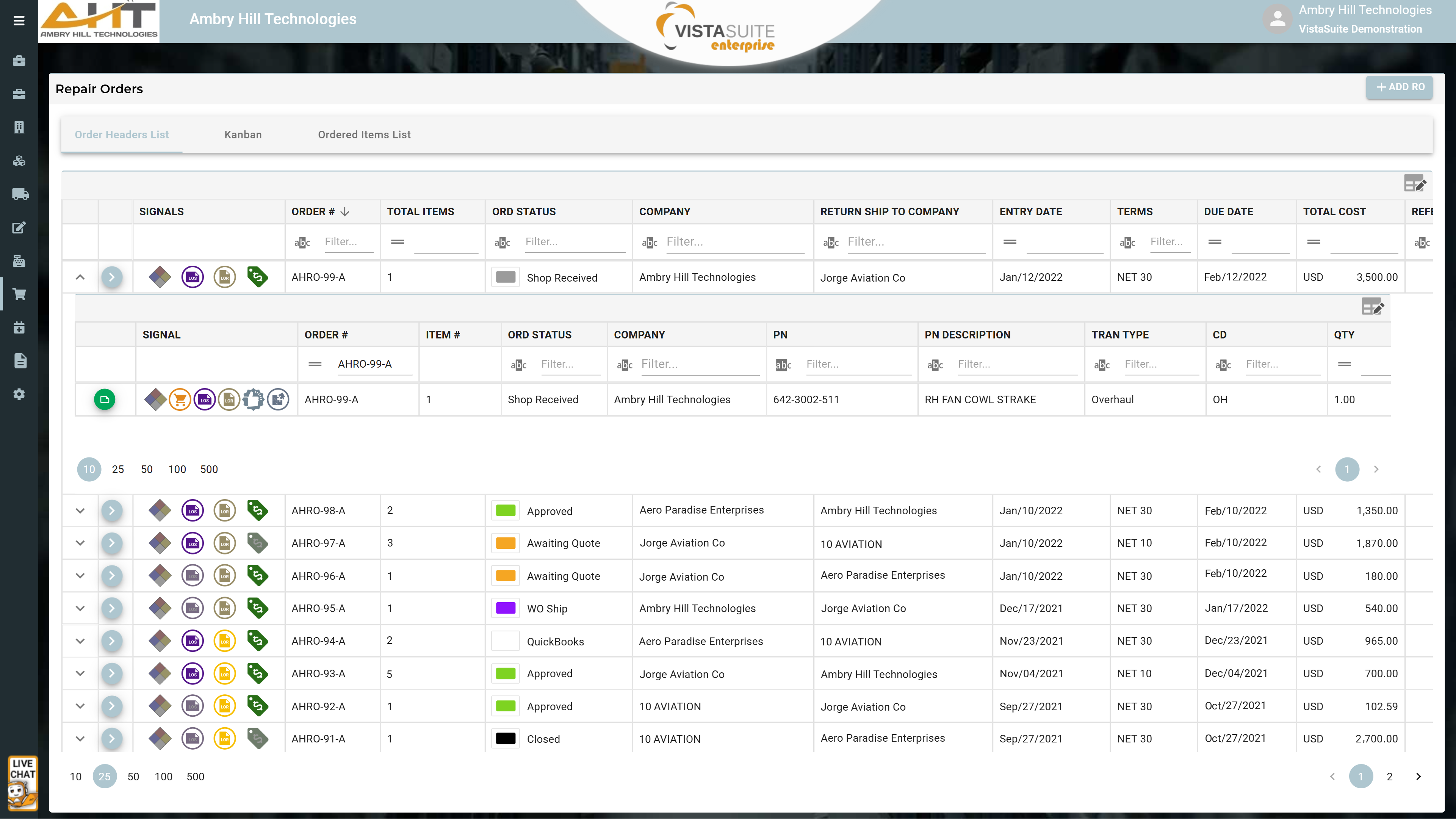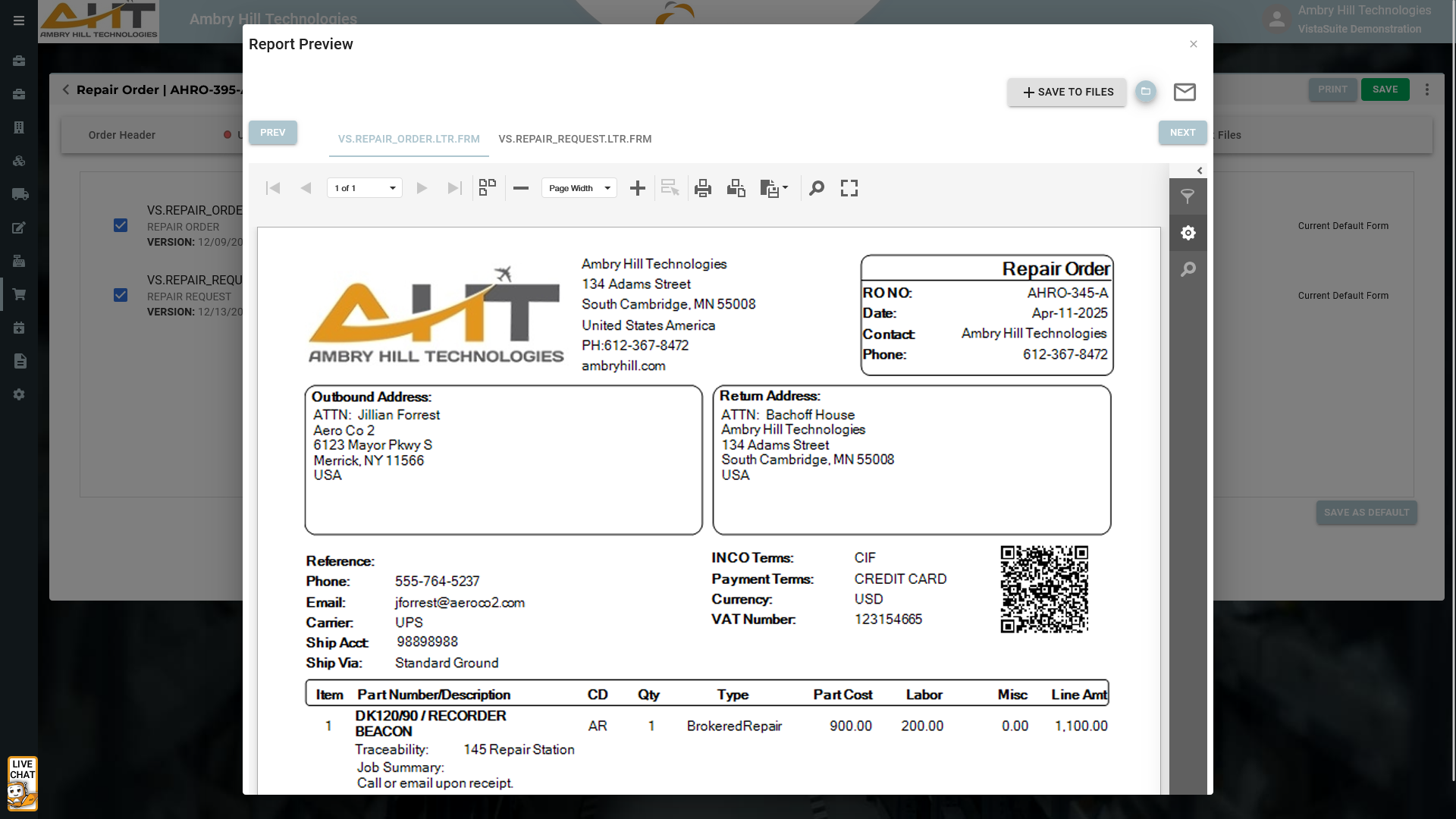 Vista-Suite Enterprise offers robust repair order capabilities tailored for aviation MRO and part 145 repair station operations. Users can assign separate outbound and inbound shipping addresses to ensure items are returned to the correct facility, including for core exchanges. Piece part costs are calculated from prior transactions, with system warnings for ownership mismatches. Charges can be applied directly to part numbers, and passthrough fields for freight and miscellaneous costs are excluded from tax. Line items can pull from regular, consigned, or pool inventory, and support multiple transaction types such as flat-rate exchange or overhaul within a single order. Repair orders link directly to sales orders, receiving events, and related transactions, with tools for copying charges, batch document printing, and customizable templates.