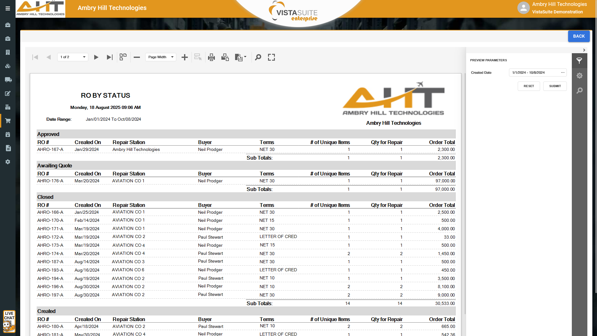 Repair Order Status: A report summarizing the status of repair orders, such as created, hold, warranty, shipped, received, and closed, for example. Customize the status names to your own requirements. The report can be tailored to list details such as repair station name, buyer, terms, number of unique items, etc.