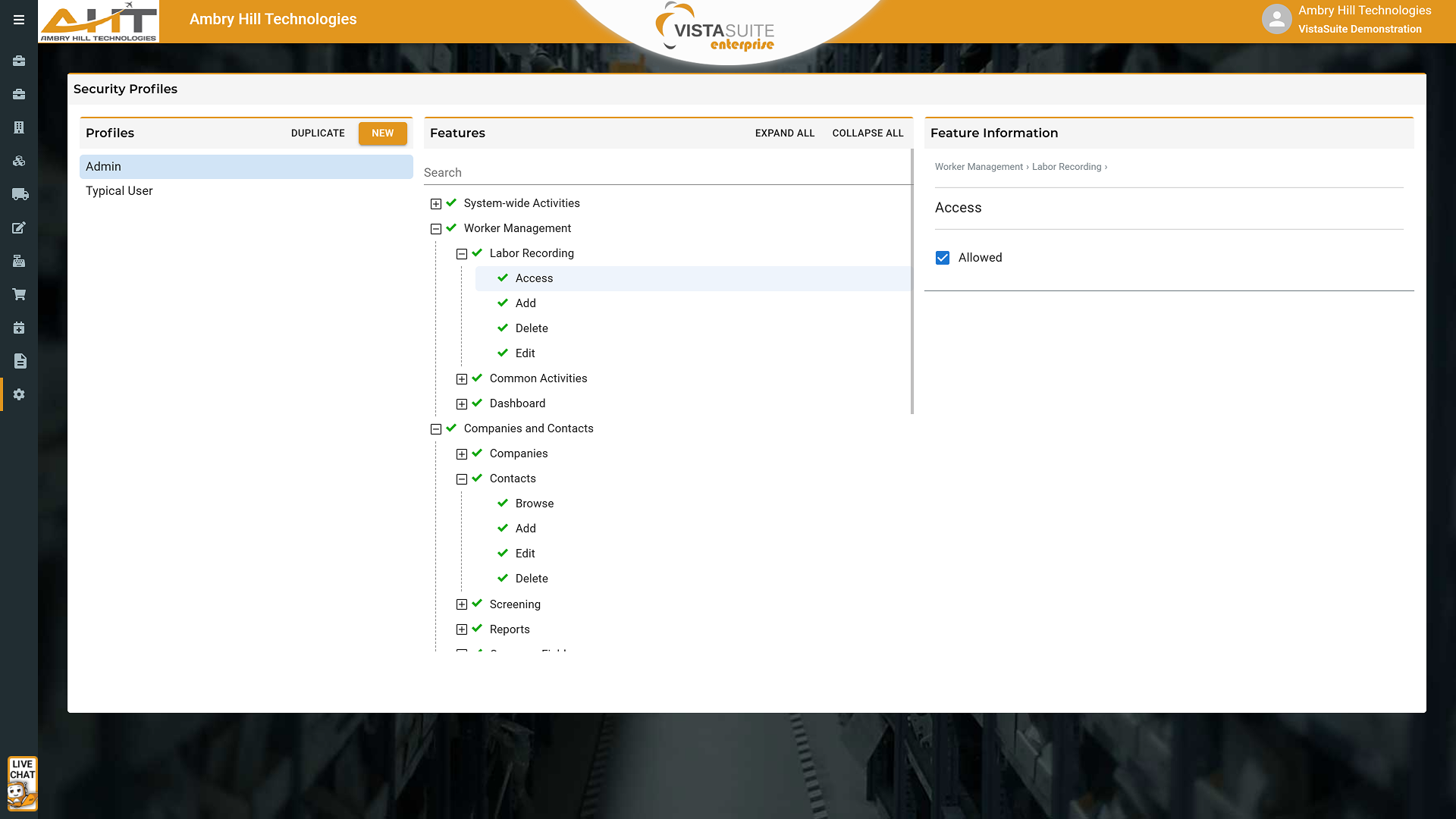 This section governs access to foundational configuration elements in Vista-Suite Enterprise such as dropdown menus, default values, classifications, and system rules.