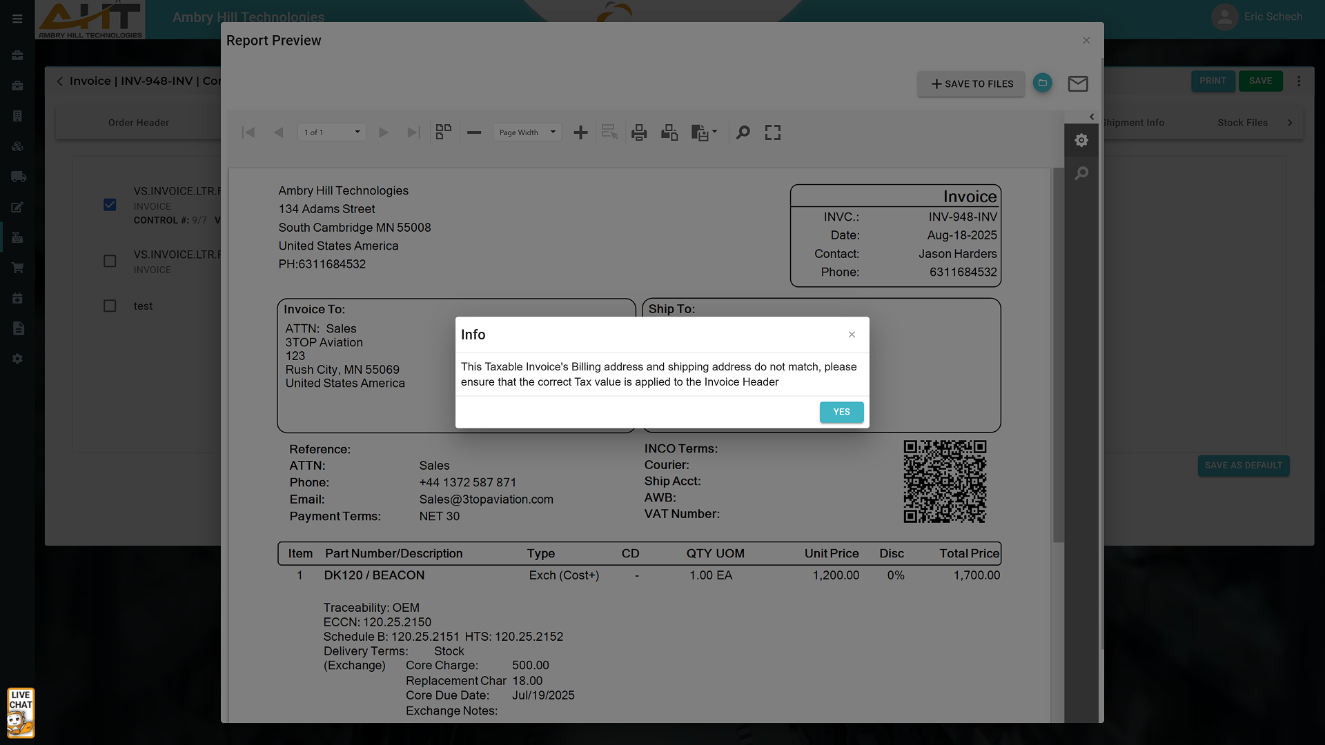 Optional Invoice setting that alerts you if an invoice is taxed and the shipping destination does not match the billing information.