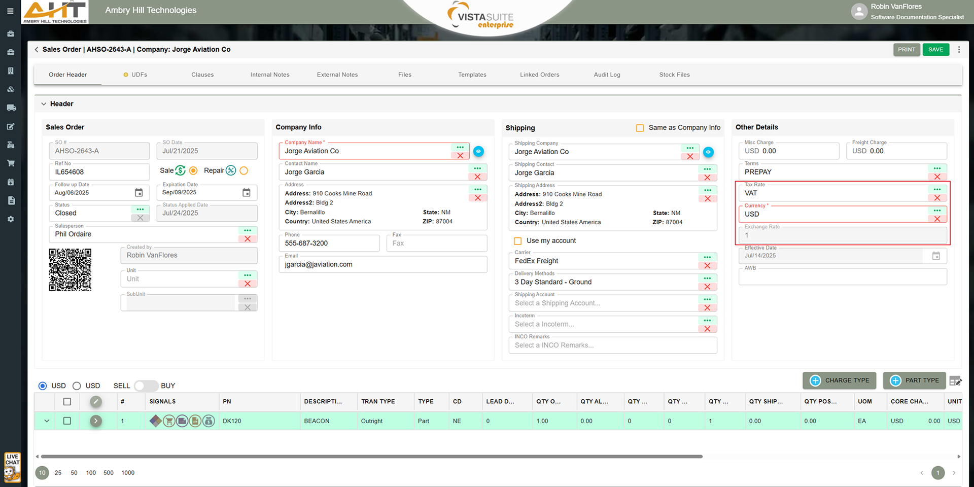 Accurate currency and tax handling at the transaction level reduces downstream issues like incorrect billing, payment delays, or mismatched financial reports. When these details are handled up front by the users entering quotes, orders, and invoices, it saves time across departments and prevents frustrating rework. Vista-Suite Enterprise includes these critical settings as part of the normal workflow, not an afterthought.